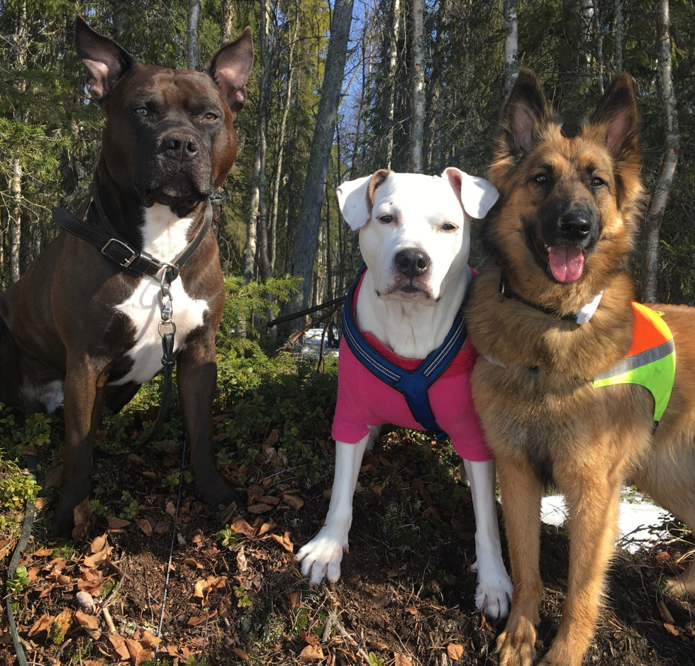 Tällä hetkellä taloudessa asustaa amstaffi Laku -17 sekä belgianpaimenkoira tervu Nila -21. Koirien kanssa harrastelemme kaikenlaista (mm. toko, PK-lajit, pelastuskoiralajit).